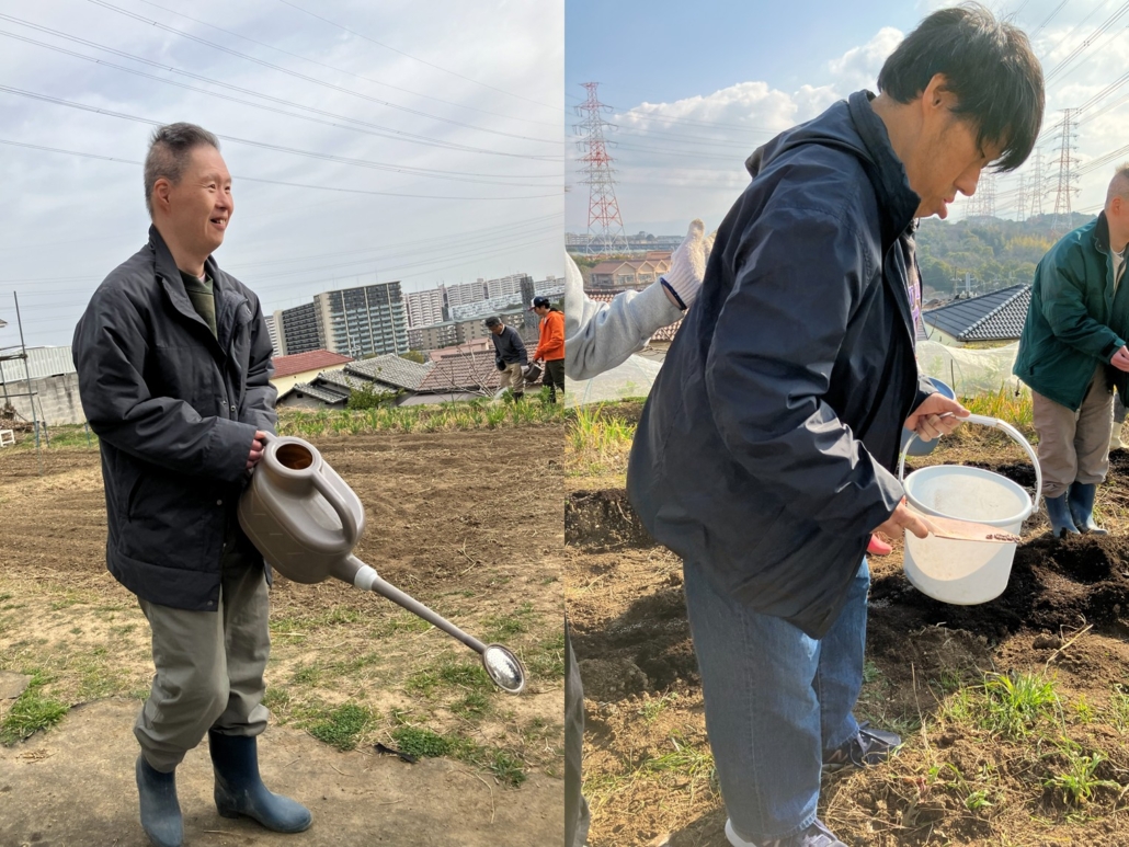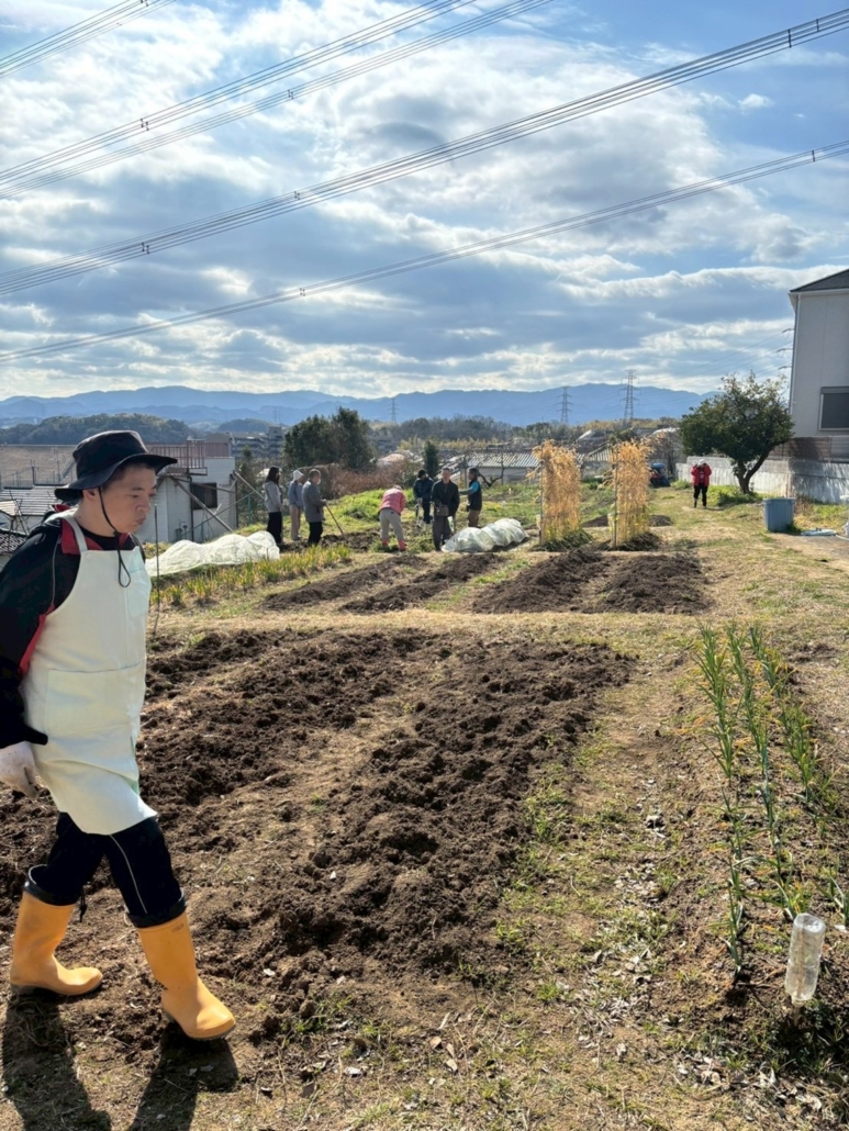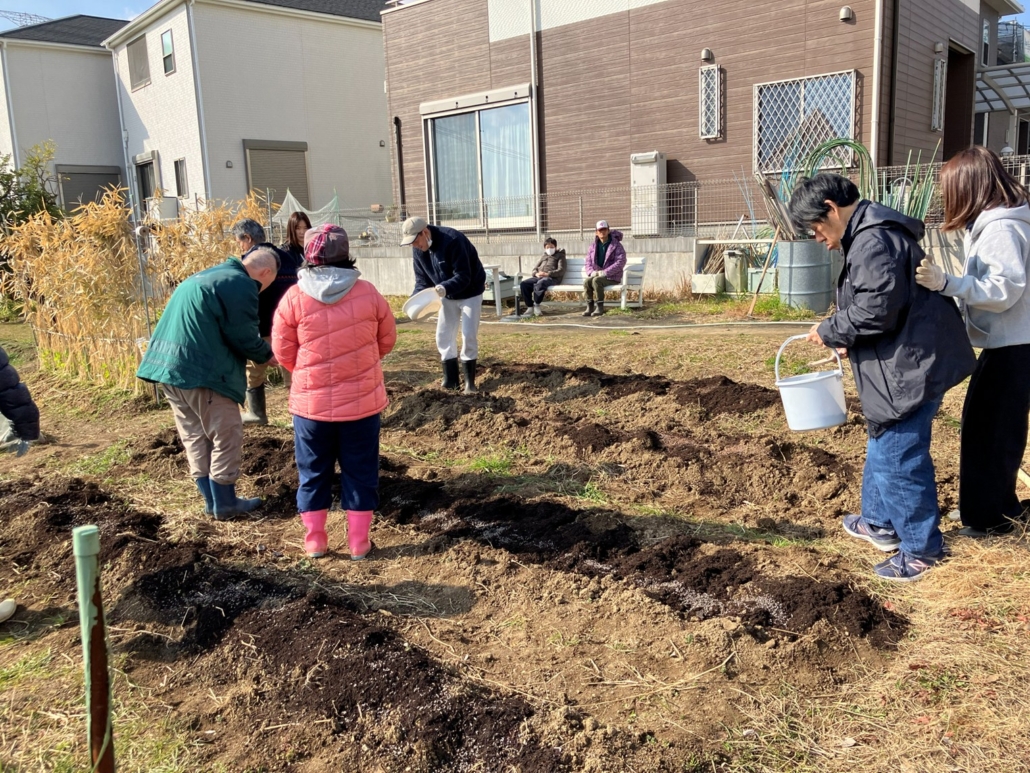 肥料をまいてみんなで耕したり、くわを使って畝たてをしました。